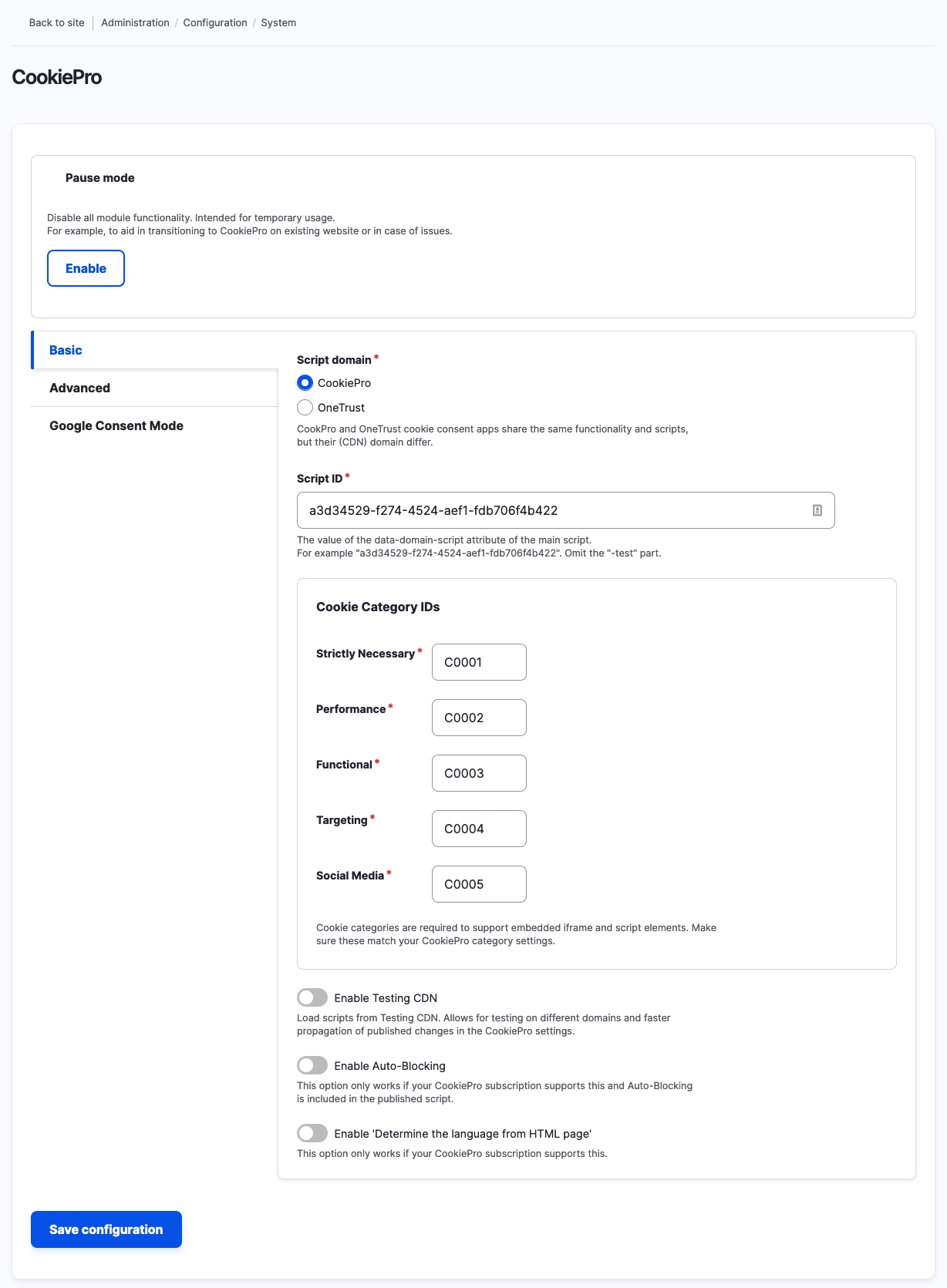 This module is mainly about being able to control CookiePro script options from Drupal config, when to inject it and having the button, cookie list snippets as tokens, blocks etc.